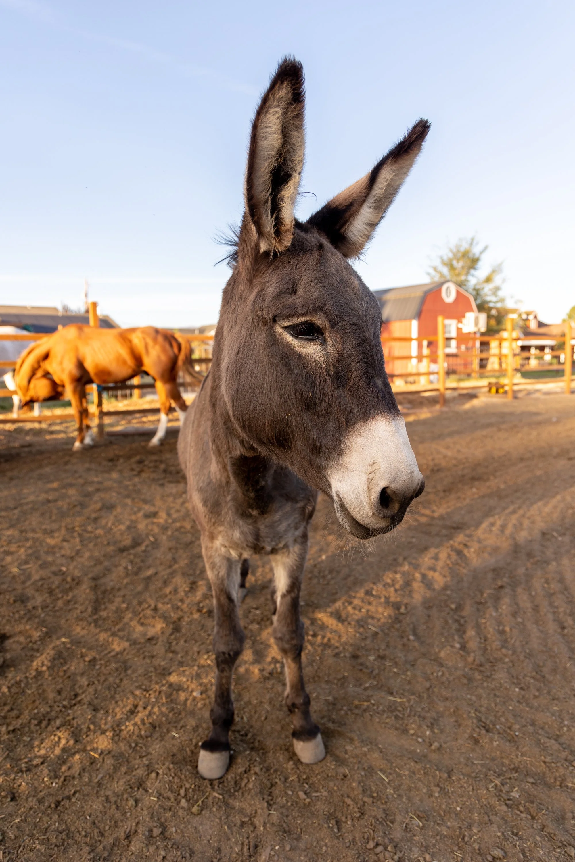 From wild to mild! Waffles was rounded up from her wild herd and held in captivity at the Wheatland, WY BLM facility, which is where we adopted her in 2021. Waffles was one of the most difficult animals I’ve worked with and trained and we love her like family now. She made Miss Alaynia question her sanity on multiple occasions but Waffles is a beloved member of the farm and totes kids around happily. She is a very affectionate donkey and loves to give hugs and rides.